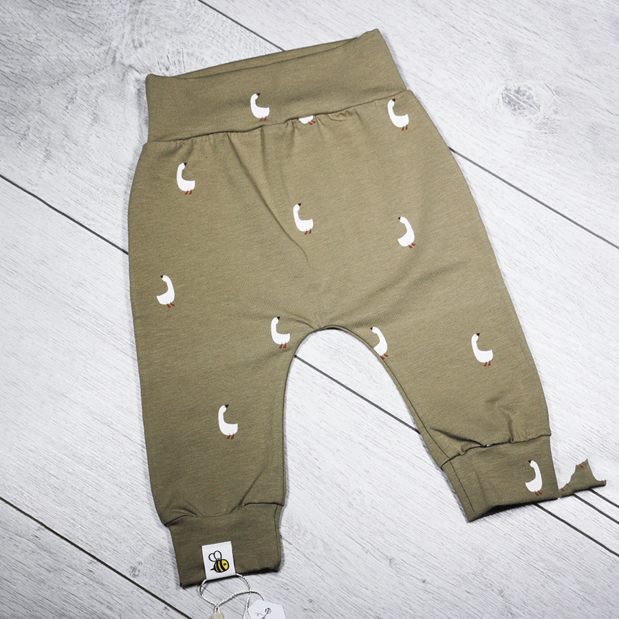 De olijfgroene kleur en speelse ganzenprint geven het broekje een rustige, natuurlijke uitstraling.
