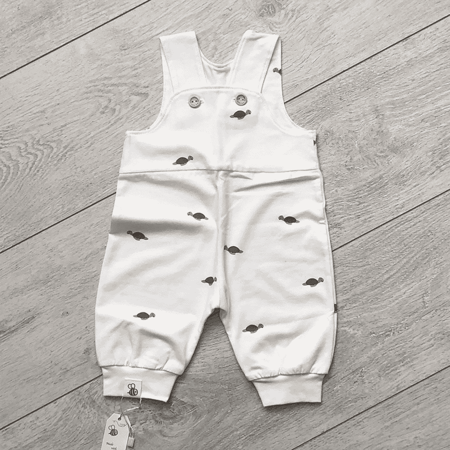 Een zacht baby tuinbroekje van tricot met een rustige Turtle Beach‑print.