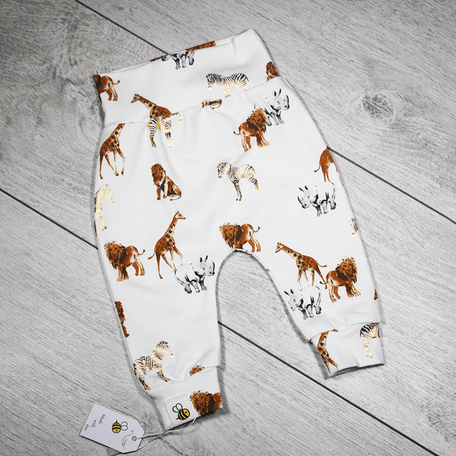 Het harembroekje Little Safari is gemaakt van zachte tricotstof met een speelse safari dierenprint op een offwhite ondergrond.