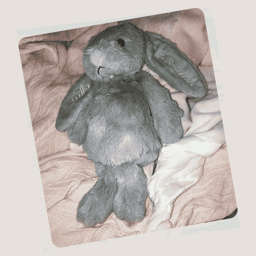 Knuffelkonijn grijs van ca. 25 cm met geborduurde oren, voorzien van een naam en optioneel een geboortedatum.