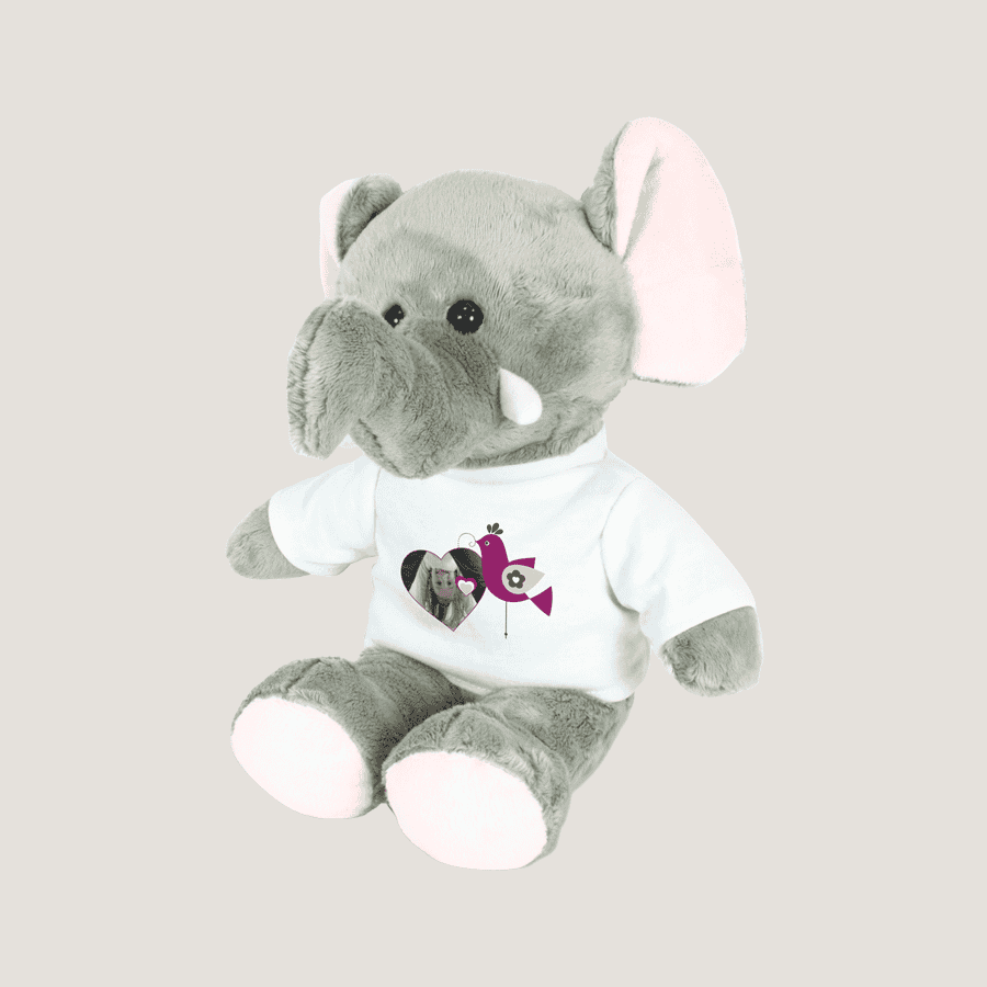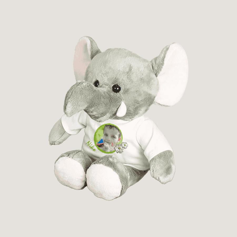 Deze Knuffel Olifant Jumbo is uitgevoerd met een bedrukbaar mini T-shirt.