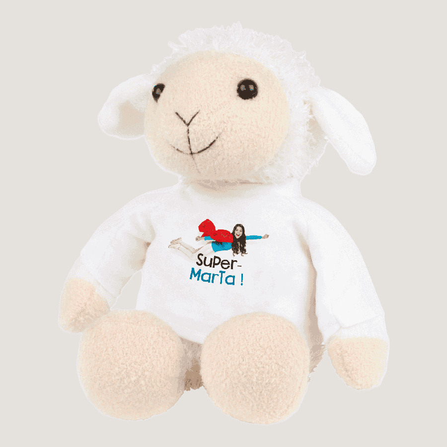 Deze Knuffel schaap is een zachte knuffel met een bedrukbaar mini T-shirt, bedoeld als persoonlijk cadeau voor jong en oud.