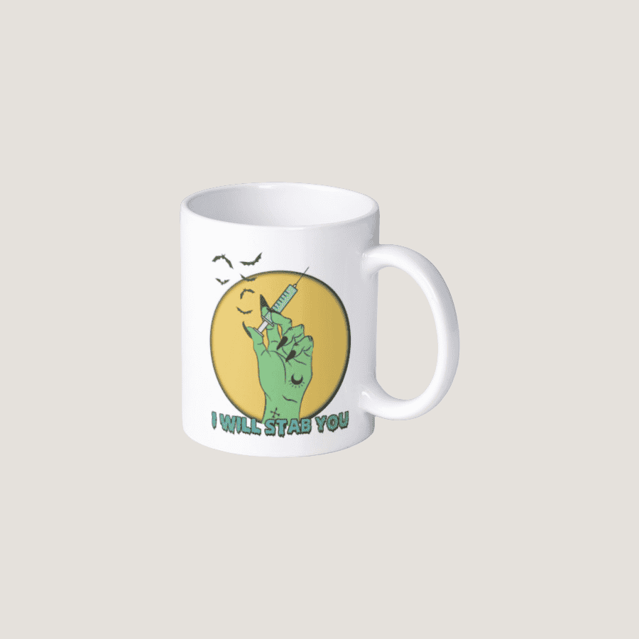 De Halloween “I will stab you Nurse” beker (mok)  met een duidelijke Halloween-opdruk.