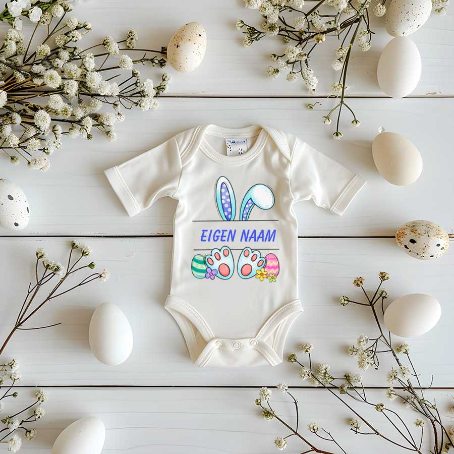 Romper “My First Easter Boy” is ontworpen om met eigen naam binnen het Paasthema, en voorzien van een herkenbaar Paasontwerp.