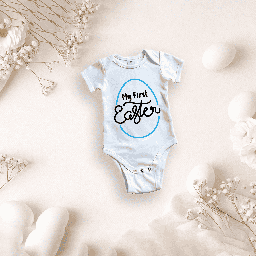 De combinatie van tekst en pasvorm zorgt voor een draagbaar kledingstuk dat bedoeld is als blijvende herinnering aan een eerste Pasen.