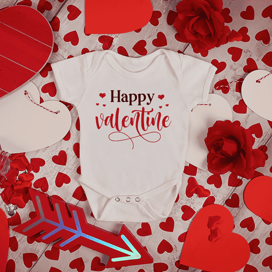 Deze valentijn romper met de tekst “Happy Valentine” is bedoeld voor de eerste Valentijnsdag van een baby.