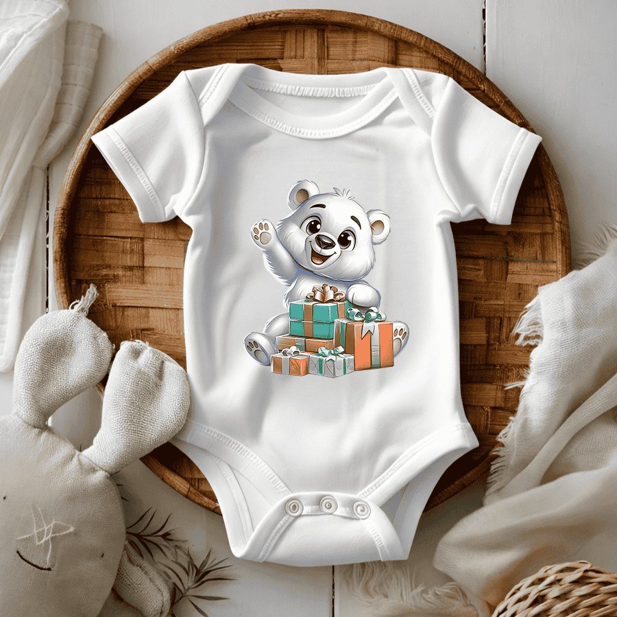 De opdruk toont een beer met cadeaus en verwijst naar de winterperiode.